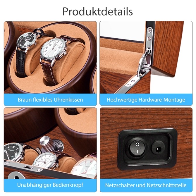 Der Uhrenbeweger besteht aus hochwertigem Holz, das umweltfreundlich ist und eine exquisite Holzmaserung aufweist, während das Kissen aus weichem Leder besteht und die Uhr gut schützen kann.